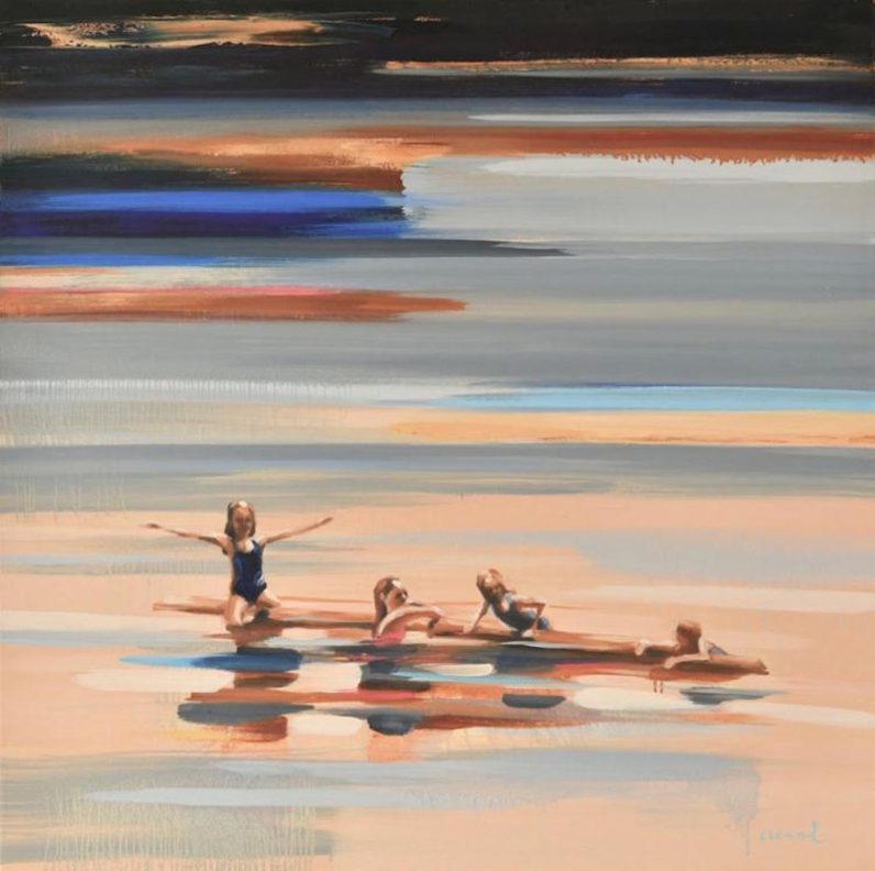 Eisenhauer refers to Lennie’s work as “abstract/figurative.” Although her subjects — swimmers, beachgoers, girls playing on a log in a Canadian river — are represented quite clearly in an impressionist fashion, the water, sky, and beach are often painted with quick, broad brushstrokes in a painterly, textured fashion, adding a mood and a design element to the artist’s work.